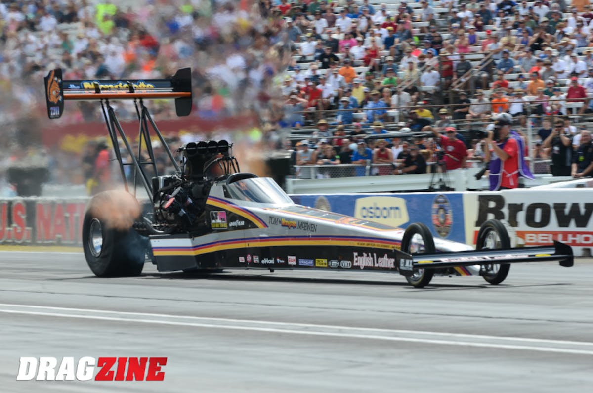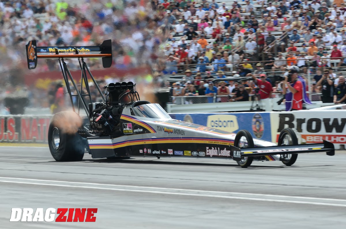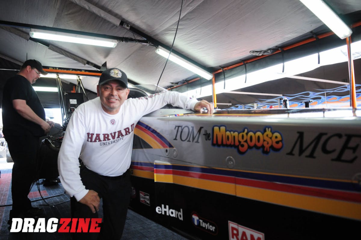 California Mike Salinas is one of two fuel teams this weekend paying tribute to the late, great Tom “The Mongoose” McEwen, who passed away earlier this season. Salinas’ dragster is carrying the colors of McEwen’s 1978 Funn Car, in which he scored his most famous victory at Indy, winning the “Big Go” just days after the death of his son.