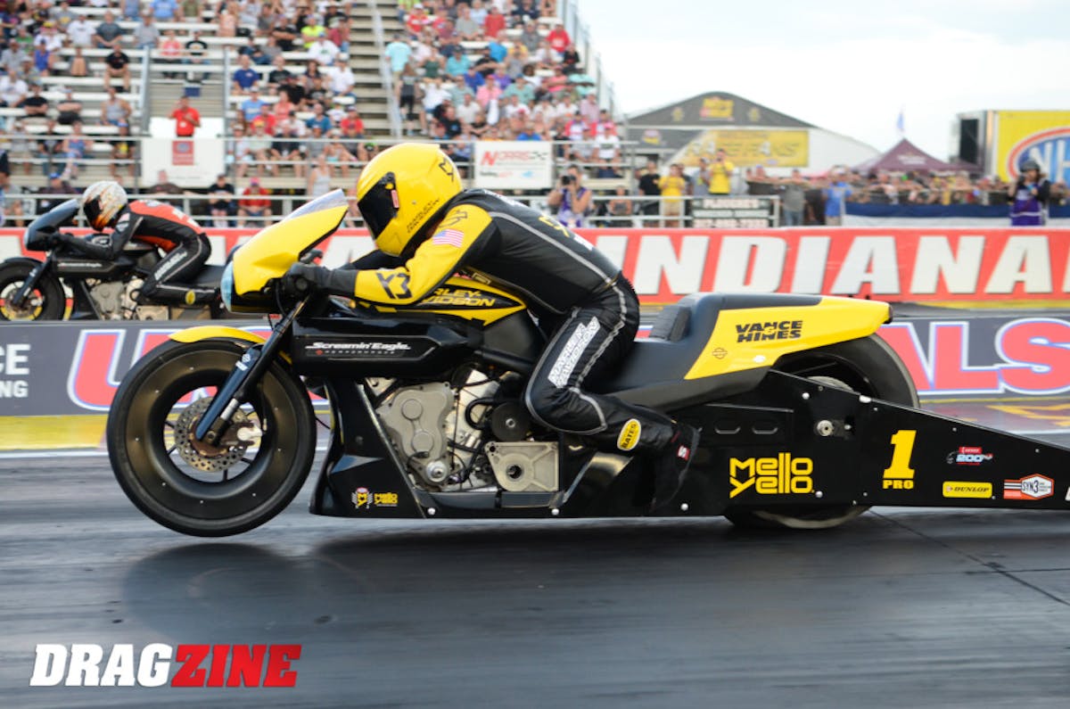 Eddie Krawiec, debuting a Mello Yello-themed Harley-Davidson this evening in front of a packed house, motored to the top spot in Pro Stock Motorcycle with a 6.825-second, 197.02 mph lap. Newly-named team rider Chip Ellis and teammate Andrew Hines sandwiched in Matt Smith in the top four, with runs of 6.850, 6.856, and 6.866, respectively.