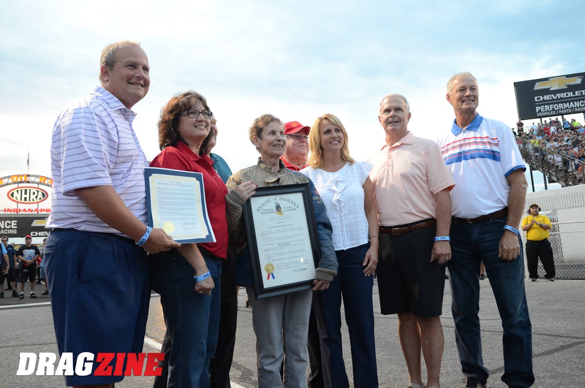 In one of the most touching of tributes, the late Bob Glidden, a Pro Stock legend and Indianapolis icon -- nevermind a prolific winner of the U.S. Nationals -- was honored this evening at the close of Pro Stock qualifying. Glidden passed away last December at age 73. Bob's wife, Etta, at his side throughout his incredible career, was on hand to take part in the tribute and accept honors from local dignitaries on his behalf. Son Billy Glidden was at the control of one of Bob's former Pro Stock machines as they were pushed down the quarter-mile in front of the hometown crowd.