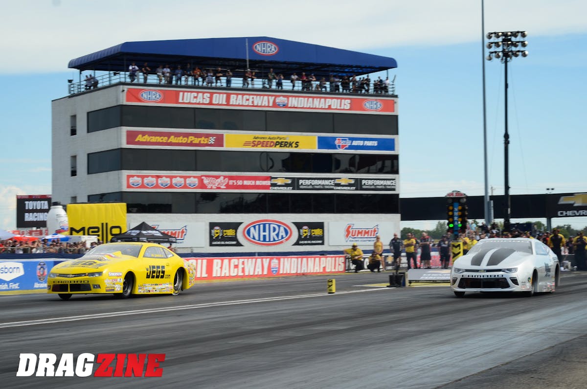 Greg Anderson (left) held steady at No. 2 in Pro Stock through Saturday's two rounds of of qualifying with his 6.621. Jeg Coughlin is seeking is fourth Indy Pro Stock victory -- he also won in Super Gas back in 1992. Coughlin presently sits sixth in the field at 6.627, two spots behind teammate Erica Enders at 6.623. Impressively, eight cars are squashed between 6.621 and 6.629.