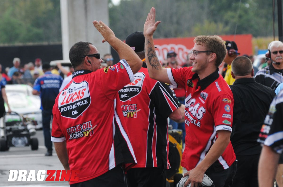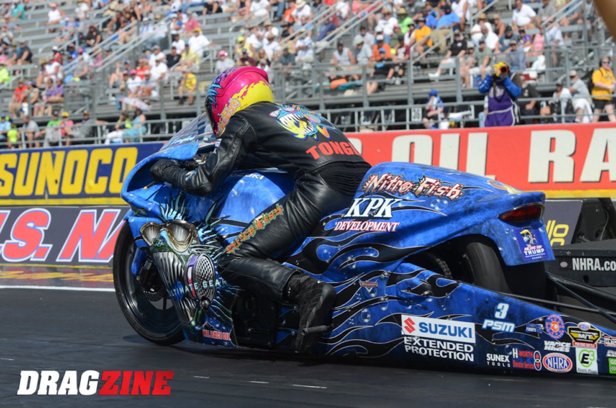 Tonglet rode to the Pro Stock Motorcycle win with his 6.864 pass at 197.10 on his Nitro Fish Racing Suzuki to defeat four-time world champion Eddie Krawiec and his Mello Yello Vance & Hines Harley Davidson’s 6.884 pass at 197.02. This is Tonglet’s second career victory at Lucas Oil Raceway, his third win on the season and 19th of his career.