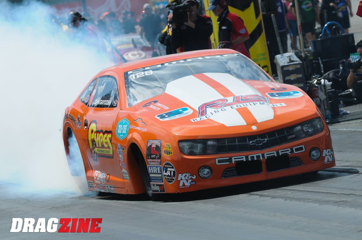 John Gaydosh, making his 10th start in Pro Stock at Indy, has never qualified for the U.S. Nationals, and he’s hinted this could be his final attempt. Gaydosh currently sits on the bump spot at 6.71, and today’s hot and muggy conditions may allow his number to hold on for a raceday start.