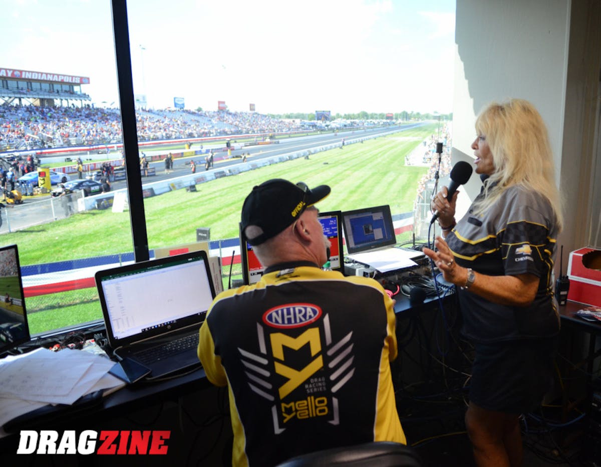 The great Linda Vaughn, a living legend in this sport in her own right, joined Alan Reinhart on the public address system this afternoon for the final session of Pro Stock qualifying. Vaughn was one of many NHRA legends on hand this weekend to sign autographs and greet her legions of fans, dating back to the 1960s.