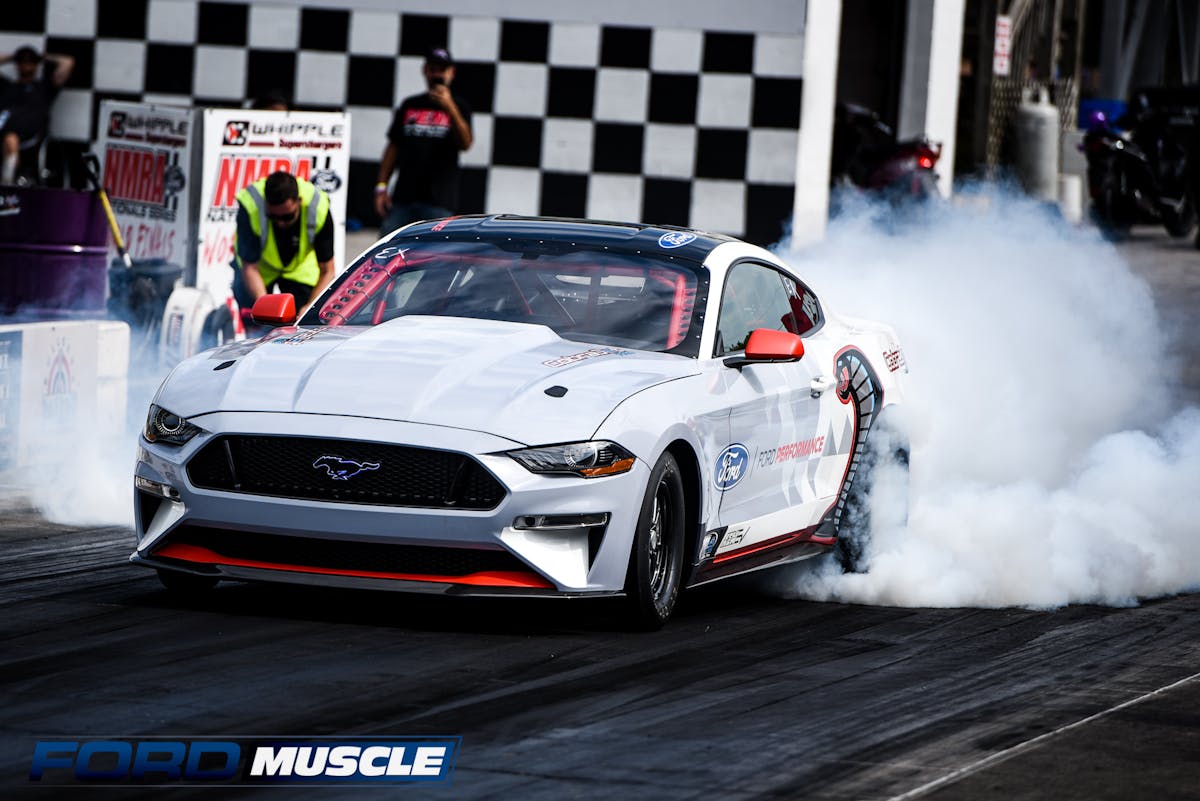 Ford Racing's one-of-a-kind electric Cobra Jet Mustang made a series of exhibition laps -- with three large battery packs (one in the nose, one behind the driver's seat, and another in the trunk), four large electric motors, the car weighs an eye-popping 5,000 lbs., but has been 8.0's in the 1/4-mile and went 8.40s here this weekend. The team says the 1,500 horsepower (and 2,000-horse-capable) machine is limited more by traction than anything in its quest for the sevens.