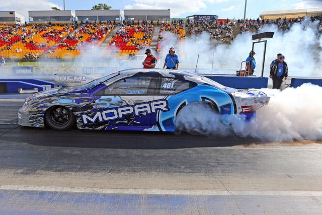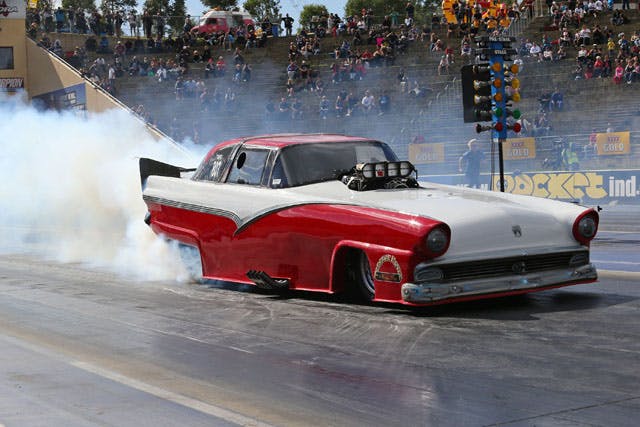 Mills looked down for the count after his retro Ford Crown Victoria-bodied Funny Car got loose off the starting line until opponent Adam Marchant crossed the centre line, an infraction that handed the trophy to Mills.