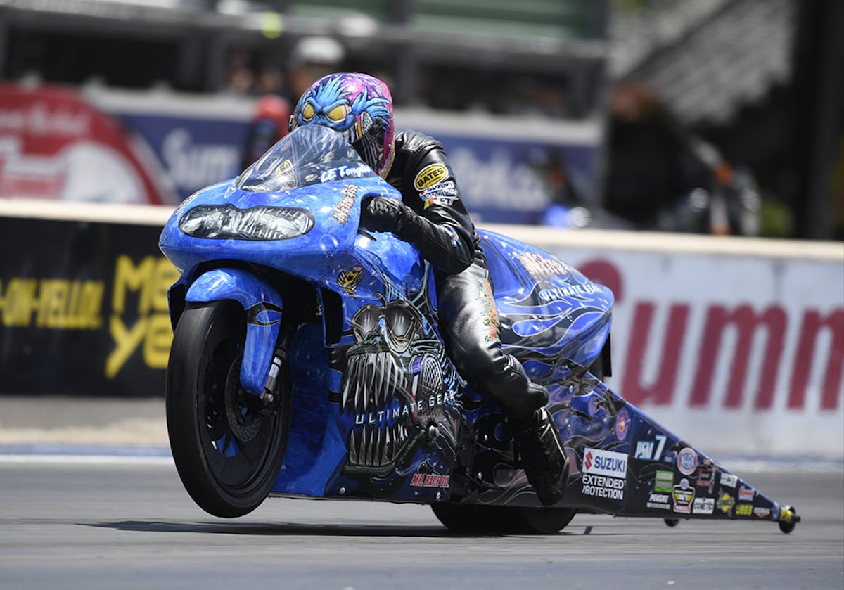 Tonglet jumped to first in the Pro Stock Motorcycle points standings and Eddie Krawiec fell to second after falling in the first round.