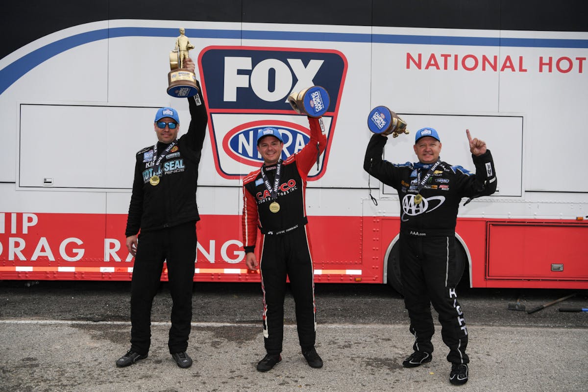 Torrence was joined in victory circle by Robert Hight (Funny Car) and Matt Hartford (Pro Stock), who won in their respective categories at the fifth race of the 2021 NHRA Camping World Drag Racing Series season. Eliminations were postponed to Monday due to inclement weather on Sunday.