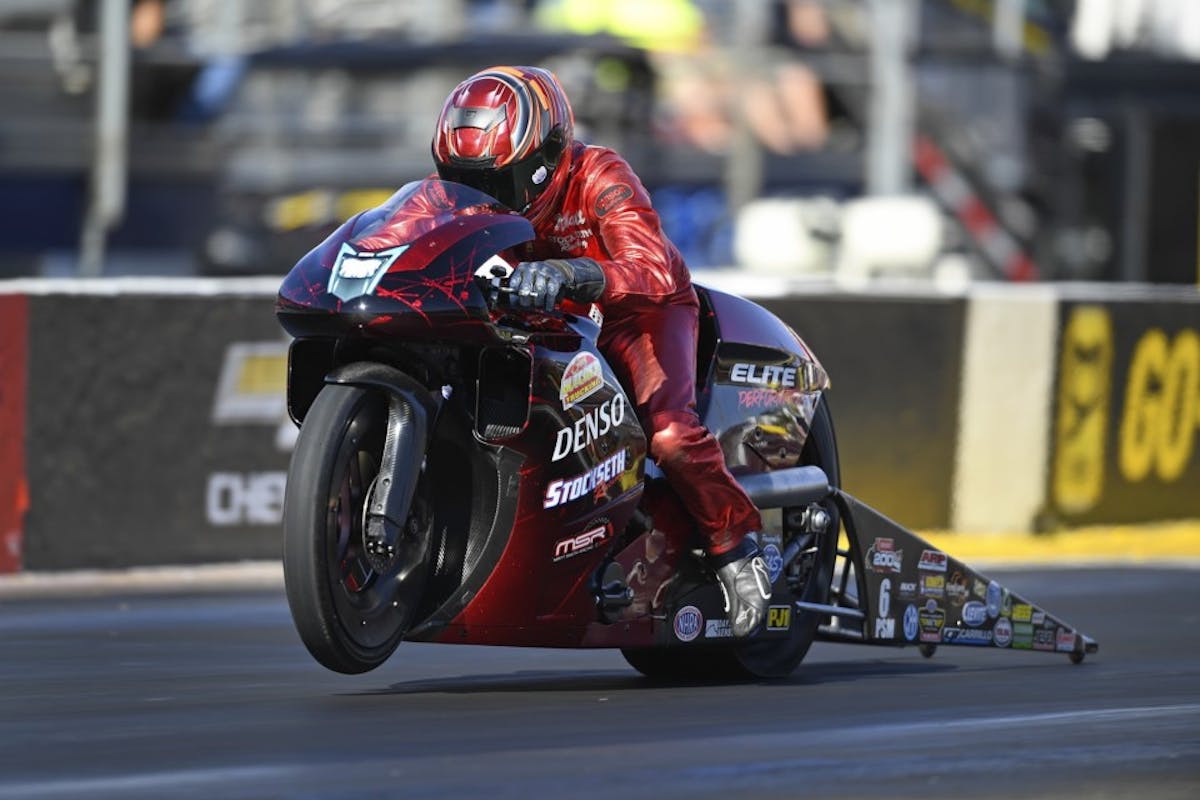 M. Smith secured his third NHRA Mello Yello Drag Racing Series Pro Stock Motorcycle world championship in the final round of eliminations. He powered his Elite Motorsports DENSO Auto Parts EBR to a 6.765 at 201.22 national speed record pass to defeat defending world champion Eddie Krawiec, who was the nearest championship contender. M. Smith defeated Angie Smith, Hector Arana and LE Tonglet en route to the finals to secure the championship and event title. This is his first world championship title since 2013.