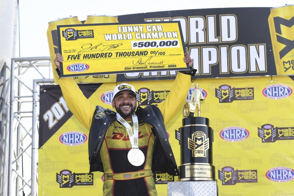 J.R. Todd clinched his first career NHRA Mello Yello Drag Racing Series Funny Car world championship title during the first round of eliminations Sunday at the Auto Club NHRA Finals at Auto Club Raceway at Pomona.