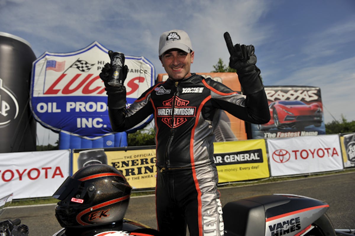 Local favorite Krawiec, former Raceway Park general manager, claimed an emotional first Pro Stock Motorcycle victory at the historic track, taking the automatic victory when his final round opponent Hector Arana Sr. fouled at the start on his Lucas Oil Buell. Krawiec claimed his 14th career victory by finishing in 6.921 at 171.45 on his Screamin’ Eagle Vance & Hines Harley-Davidson.