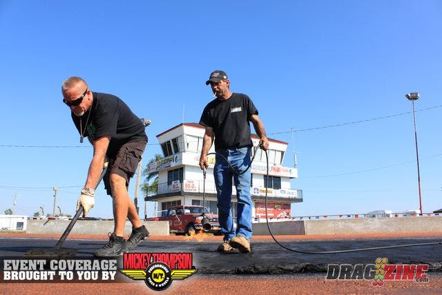 Assorted Pro Stock, Pro Mods and other teams have been testing here in Bradenton for the past couple of weeks. The crew was scraping some built up rubber from the surface this afternoon getting ready for tonight's test session and the weekend racing.