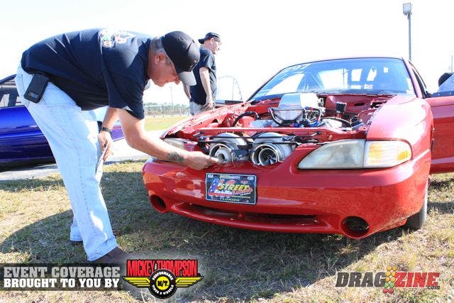 Track official Keith Adams checks the inlet of Markwich's turbos in tech this afternoon. TRZ Motorsports machined several gauges for checking inlet size of various turbos and blowers for X275 founder John Sears, who is also on hand this weekend.Former NMRA Hot Street racer Tim Eichhorn has made the move to Ultimate Street after the racing organization discontinued the class. He runs a naturally aspirated 400 cubic inch small block Ford assembled in house at Mustang Performance Racing in Boynton Beach, Florida. Steve Matukas built the chassis several years ago and Tim runs a Pro Trans Proflight Transmission with a Neal Chance converter and can be 300 pounds lighter than he ran previously with the NMRA. He is sponsored by BlowbyRacing and UPR.