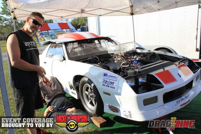 Stanford Connecticut's John Schroeder is here running T & J Services Outlaw 632 this weekend. He put his 2002 Camaro in the poll with a fantastic 4.59 @ 157 MPH to lead the other 19 cars in class, some of which are here testing for Leaf Spring or Outlaw 275.Wade Gullett is still wearing battle scars after an incident with the wall here at Bradenton at a prior event. He sits on the bump after having trouble on the run and shutting down early.