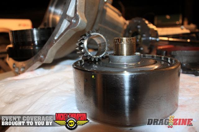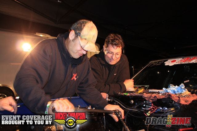 Troy Pirez Jr. (left) lends a hand with getting Ziff Hudson's Zypher fixed up after eating a piston today.Another casualty of the evening belong to Bryan Marrow who had the mak gear in his transmission shear on his full run attempt this afternoon. They hope parts from ATI arrive in time to make repairs and are trying to source a passable replacement just in case.