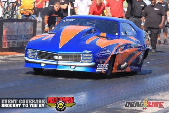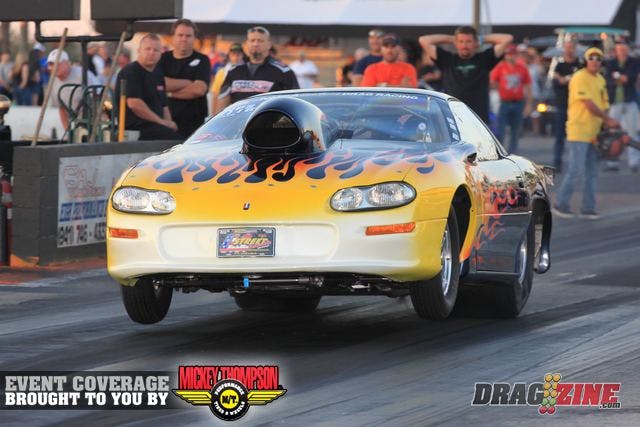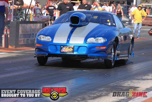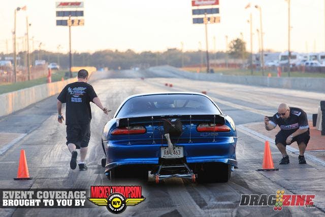 Jose Gonzalez put his Pro Line Race Engines powered Pro Mod Camaro in the numbner one position with a 4.001 @ 195 MPH towards the end of the session.Ruben Tetsosvilli is here with his new Pro Lite Battery Pro Modified Camaro for it's race debut. He has made some short hits to the 60' so far this weekend. The Nelson Competition powered car was built by Teddy Houser Race Cars. We will have a full feature on this car coming soon.Melbourne, Florida racer Dan Bandish had a nice launch on his first attempt but moved out of the groove down track and had to lift early. He sits 14th with a 5.38 @ 90.