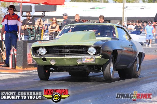 Mike Meeks is running X275 this weekend with his LS Powered 5th gen Camaro. His second run today was a 4.96 @ 141 putting him in 6th so far. He runs a Pro Systems SV1 carb and nitrous.Bobby Flippen is rolling out with his nitrous inhaling 2001 Camaro. Flippen is based in Glaucester, Virginina and his 4.860 @ 147 has him 4th of 21 cars vying for 16 spots today.John Snyder inproved his lot in Ultra Street with a 5.104 @ 134, better by a full tenth from his first round pass earlier today.J.R. Atkins improved his time in OL632 from a 4.72 to a .67 but fell one spot to 5th. Atkins won class at the Tomato Nationals earlier this month in Immokallee.Jimmy Keen put up a nice 4.96 @ 189 in Pro Mod and improved to 3rd with his 1963 Corvette based out of Parish, Florida.