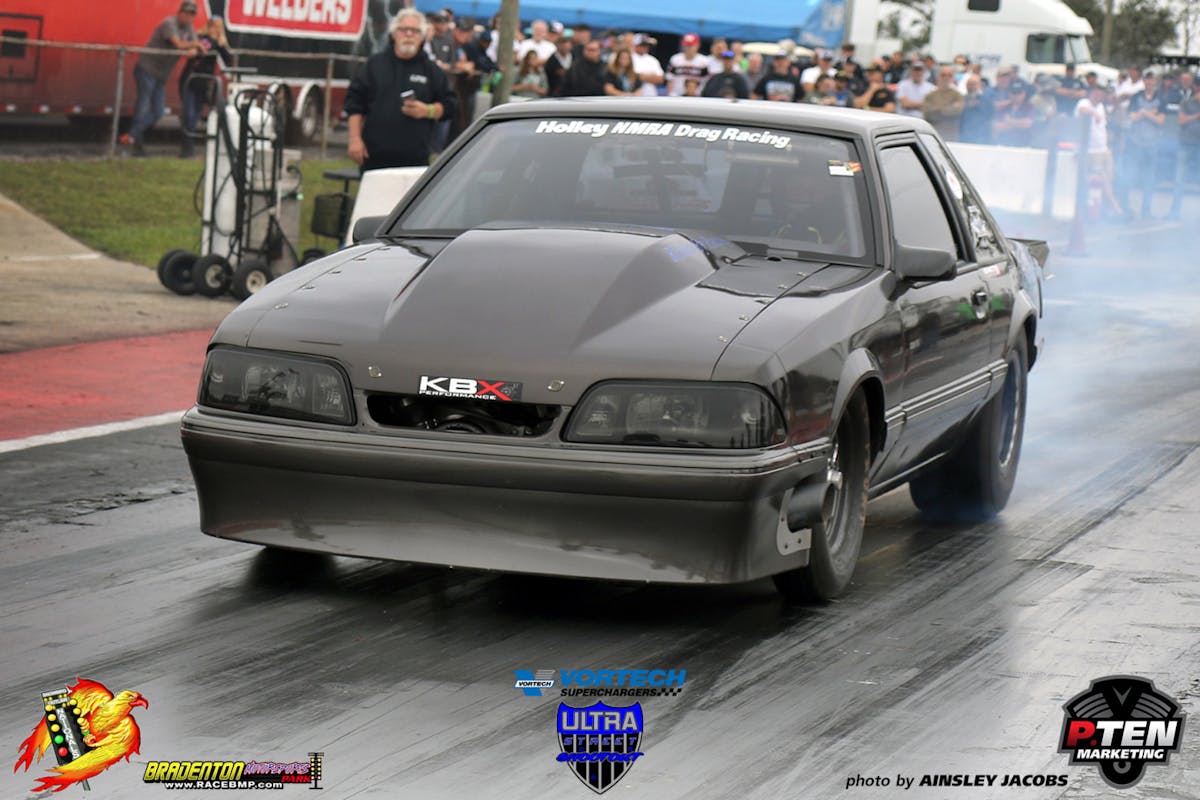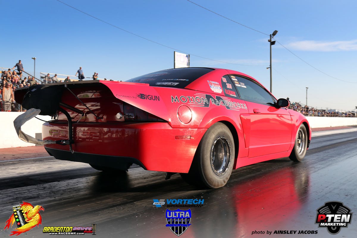 Longtime Mustang racer Mike Dez was on the property to manage Chuck Bartholme’s Fox body Mustang for the weekend and Bartholme ranked ninth in the order on a 4.653 at 153.68 mph effort. “We run a 430-inch small-block Ford with a Vortech supercharger, and this is a brand new motor for us,” stated Dez, who admittedly struggled the first two days of testing leading up to the main event. “We got it figured out, though. This class is super competitive and John [Sears] has everything in check for ultra-competitive racing. It makes us have to work both on the cars and on the driving to be more consistent.”