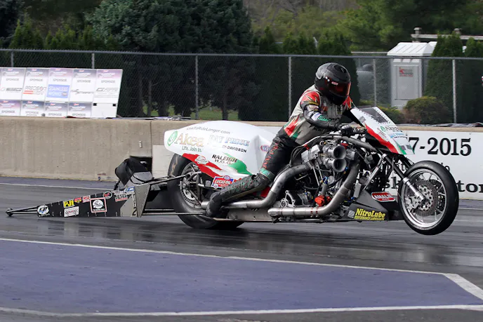 Tommy Grimes ShakedownA new class to this year’s event, Top Fuel Harley saw veteran rider Tommy Grimes of Clemmons, North Carolina rocket to a 4.31 at 189 mph for the win over Norton, Ohio rider Larry Stanley’s 5.22 at 144 mph.