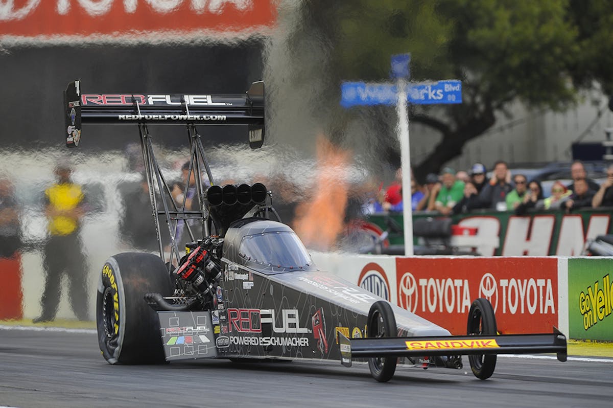 Langdon earned his second Top Fuel win of the season, sweeping both Wally trophies at this track for the second time in his career. Langdon, who won the season-opening Winternationals in the cockpit of an Alan Johnson Racing dragster, defeated Antron Brown in the final round in a Don Schumacher Racing machine. Langdon powered his Red Fuel dragster to a 3.715 at 332.43 to finish in front of the recently crowned world champion, who posted a 3.732 at 321.73 in his Matco Tools dragster.