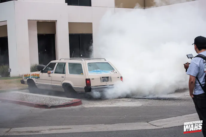 What Team Bigun didn’t know was a massive curveball was coming their way in the form of a ragged 1982 Granada station wagon. As the teams were getting ready to move their vehicles inside to begin work, Gutridge, a thorn in Team Bigun’s side a year ago on and off the racetrack, brought the Grenada around the corner and presented it to Team Bigun. After taking possession of the wagon, Lyle promptly roasted the tires right off of it.