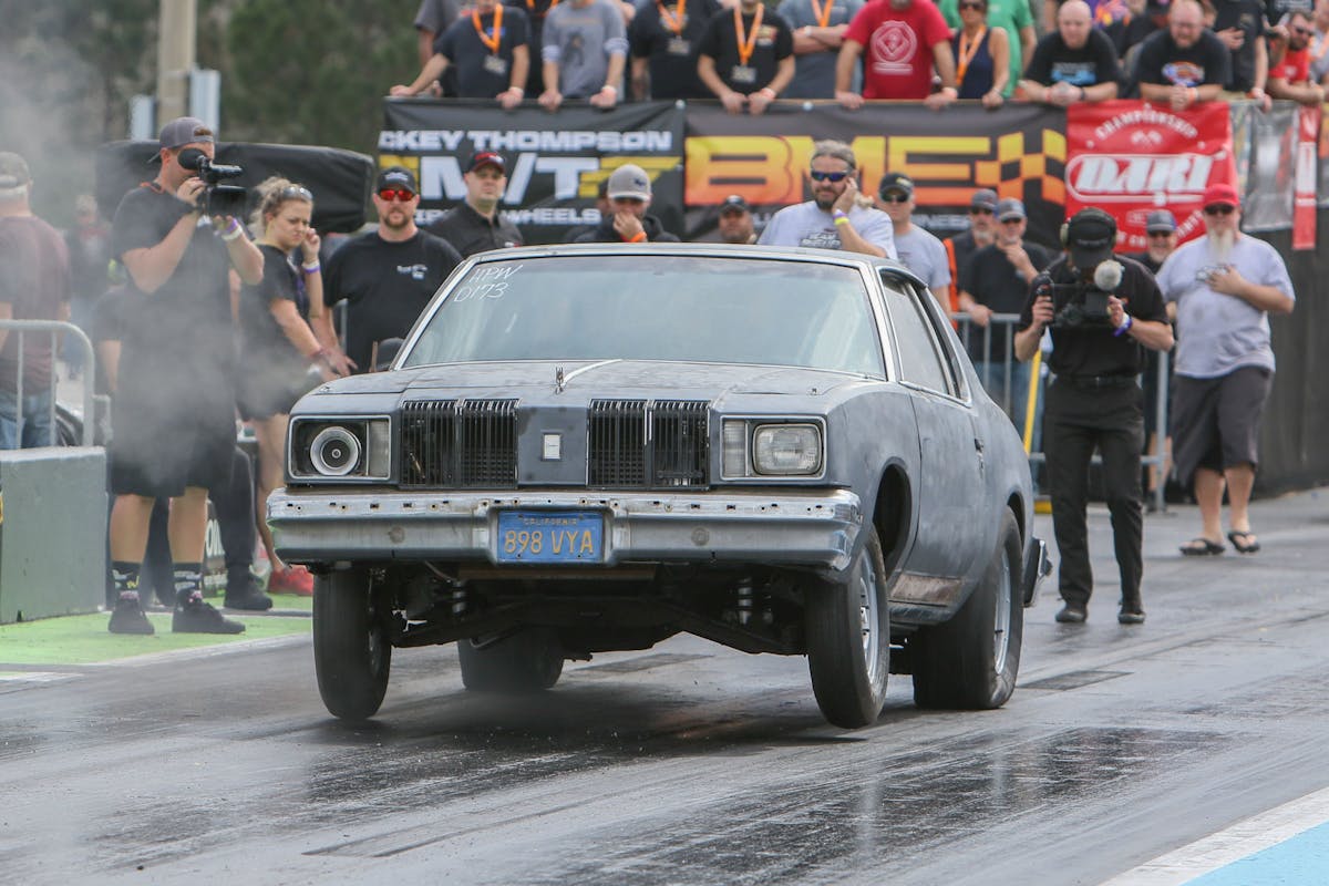 The only team that was ready to go when racing began at SGMP was Midwest Mayhem. The Junkyard Dog Cutlass was the first to fire during the build portion and was the first on the dyno to make a pull, as well. When qualifying began, Team Midwest Mayhem was the first team in the staging lanes to make a hit — but it wasn’t perfect. The Cutlass’s turbocharged mill experienced a fuel pressure issue that kept it from making a strong pass, but it did light the boards with a 6.112 at 111 mph.