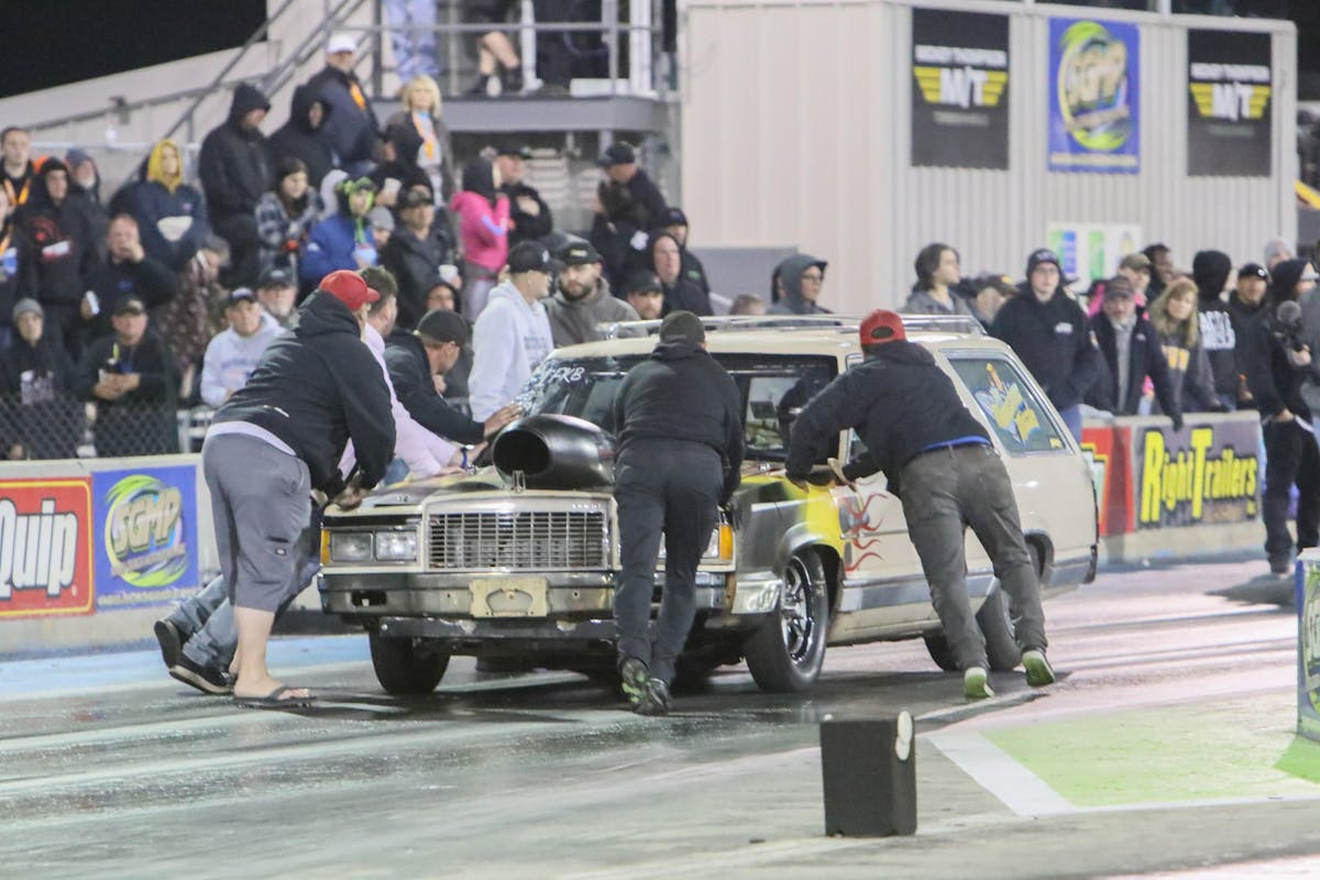 The second round of qualifying would prove to be the most dramatic and costly for nearly every team of the $10K Drag Shootout. Team Midwest Mayhem had no experience racing on radials or on a track that was as heavily prepped as SGMP, and that proved to be a major issue. During its second qualifier, Midwest Mayhem failed to make a clean pass, threw the alternator/water pump belt off the engine, and had a head gasket failure, so the Junkyard Dog was only able to record a 8.029 at 119 mph. The team thrashed through the night and used $200 of its repair budget to get the car ready for racing the next day.