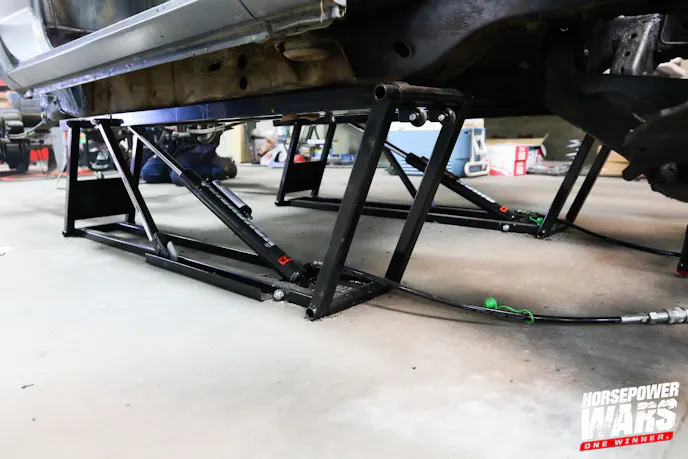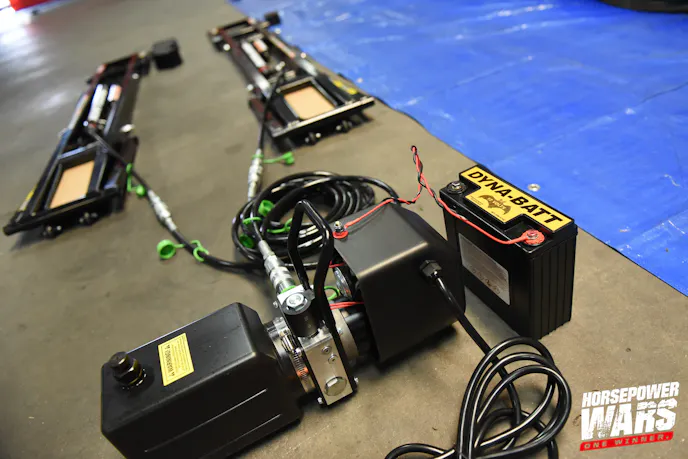 The teams this year are utilizing Bendpak’s QuickJack BL-5000SLX mobile lifts to assist in their builds as the Horsepower Wars build center moved to a new location. These versatile, portable, lightweight, and rugged 5,000-pound capacity lifts feature a 21-inch rise, 3-inch lowered height, and measure 70-inches in length. Urethane wheels make it easy to pick the lifts up by hand and glide to your next destination. And because each frame operates independently, fluid pressure is controlled by a flow divider to ensure equal pressure in each frame. The lift pumps are being powered by Dyna-Batt batteries — we’ll see more of these in future episodes as teams install Dyna-Batt units in their vehicles. And since they run off the single 12-volt source, that means they can also be taken to the track. This will come in handy as you’ll see later!