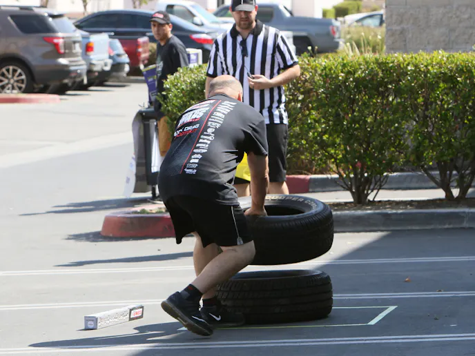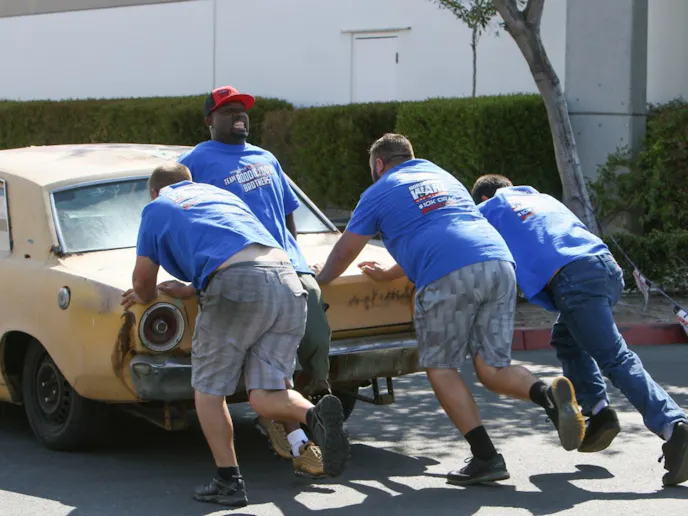 Next, the teams had to grab a set of keys and head outside where they pushed the Ford Falcon 100 feet one direction, and then back the other direction with another teammate inside. After they were done pushing, a member of the team had to take a stack of tires and move them one at a time to a box several yards away. Finally, there was the cart push where two team members had to push a cart full of boxes around the building as quickly as possible, while keeping all of the boxes on the cart.