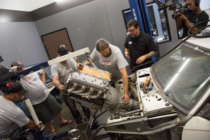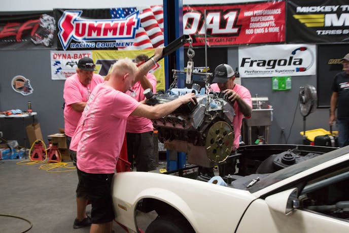 After each team had their engine buttoned up and ready, they began the process of shoehorning them into their car. Team Bigun was the first team to snuggle their boosted LS-based engine into its home using a set of used LS engine mounts. The Dream Team was right on their heels and had their 5.3 liter engine in place, but opted to use a new mid-mount motor plate from Summit Racing Equipment. Team Boddie also used motor mounts from Summit but had a foam engine they used for mock-up to speed up the process as they worked on finishing their mill. Team Stinky Pinky followed suit with Team Boddie, acquiring motor mounts from Summit, but they were behind the rest of the teams getting the engine in place.