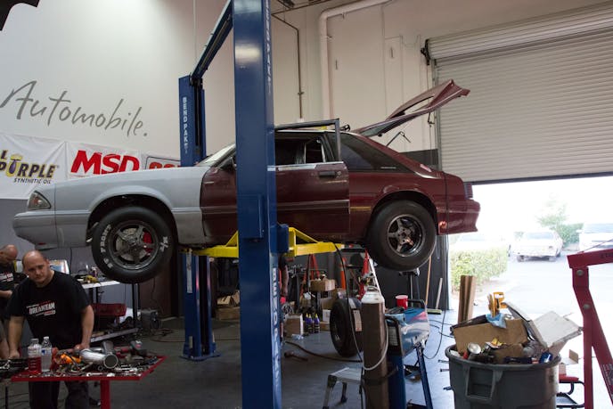 Unlike Team Boddie and Team Stinky Pinky, the guys on Team Bigun decided to skip the big cubic-inch approach and use a 5.3-liter LS-based engine to power their Mustang. To get creative they filled the stock block with Home Depot-bought concrete to seal up the water passages. The team used stock LS LM7 heads that were ported by engine builder Pete Harrell, and mostly stock internals (aside from the Mahle pistons, pins and rings) that have been outfitted with ARP studs, fasteners, and rod bolts to add serious strength. A gently-used BorgWarner S475 is providing the boost through a turbo system the team fabricated, and a dry shot of nitrous is being used in place of an intercooler to chill the incoming air charge.