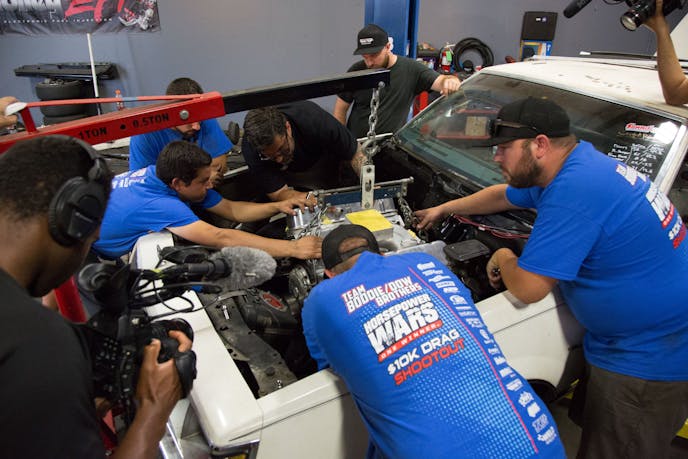 On last week’s episode of the $10K Drag Shootout things got a little tense in the shop as Team Boddie received a 50-pound weight penalty and had to pay the full price for the ported cylinder heads they received. The teams continued to work on finishing their cars with Team Bigun completing their chassis, while Stinky Pinky fell behind. Team Boddie also bounced back from the cylinder head controversy to win the Taco Eating contest, scoring a free nitrous kit from Nitrous Oxide Systems. Meanwhile, the Dream Team came in last in the feeding frenzy and had to be chained together for two hours, with the larger storyline of Big Daddy Dwayne Gutridge’s trash-talking.