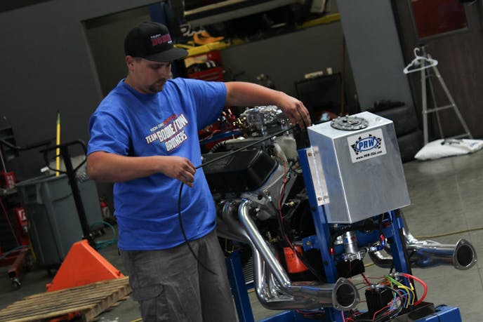 The electricity in the air grew inside the shop because the next challenge in the $10K Drag Shootout was coming at the teams. This time it wasn’t trays of tacos greeting each team — it was the E3 Spark Plug Wire Challenge, with plenty of blank wires ready to be made. Each team had to assemble a set of E3 spark plug wires in the shortest amount of time, then they had to be installed using the proper firing order on the PRW engine test stand. Each team also had to keep their wires as short as possible since two seconds of time was added for each inch of wire length.
