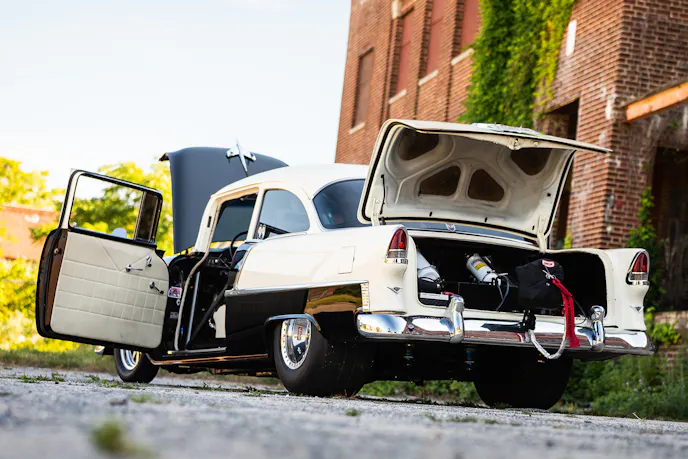 Powering Caron’s ’55 is a 408 cubic-inch SBC, built upon a Dart Machinery Little M block with Air Flow Research 235 23-degree heads and ported Edelbrock intake. An Accufab 105mm throttle body combines with a Wilson elbow. JE pistons, Crower connecting rods, and Lunati crankshaft comprise the rotating assembly.
