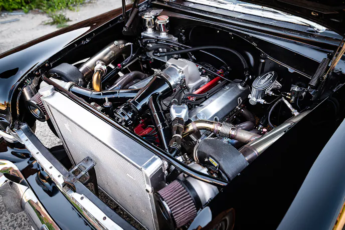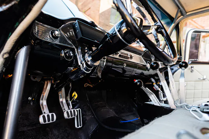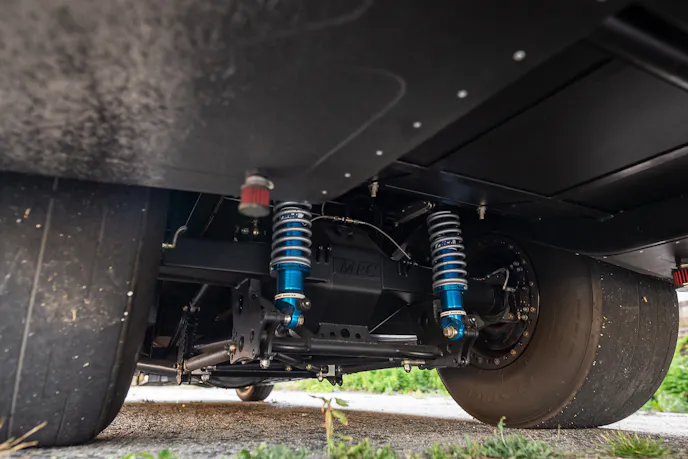 The square-tube, back-half frame and roll cage are painted charcoal gray on the interior, and hot rod matte black in the engine bay. The four-link rear suspension has an anti-roll bar system and an X-style rear suspension track locator, which are all hand-fabricated.