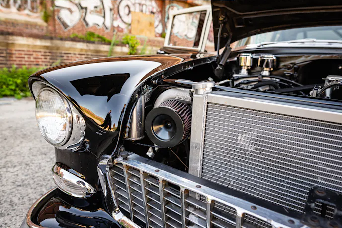 Powering Caron’s ’55 is a 408 cubic-inch SBC, built upon a Dart Machinery Little M block with Air Flow Research 235 23-degree heads and ported Edelbrock intake. An Accufab 105mm throttle body combines with a Wilson elbow. JE pistons, Crower connecting rods, and Lunati crankshaft comprise the rotating assembly.