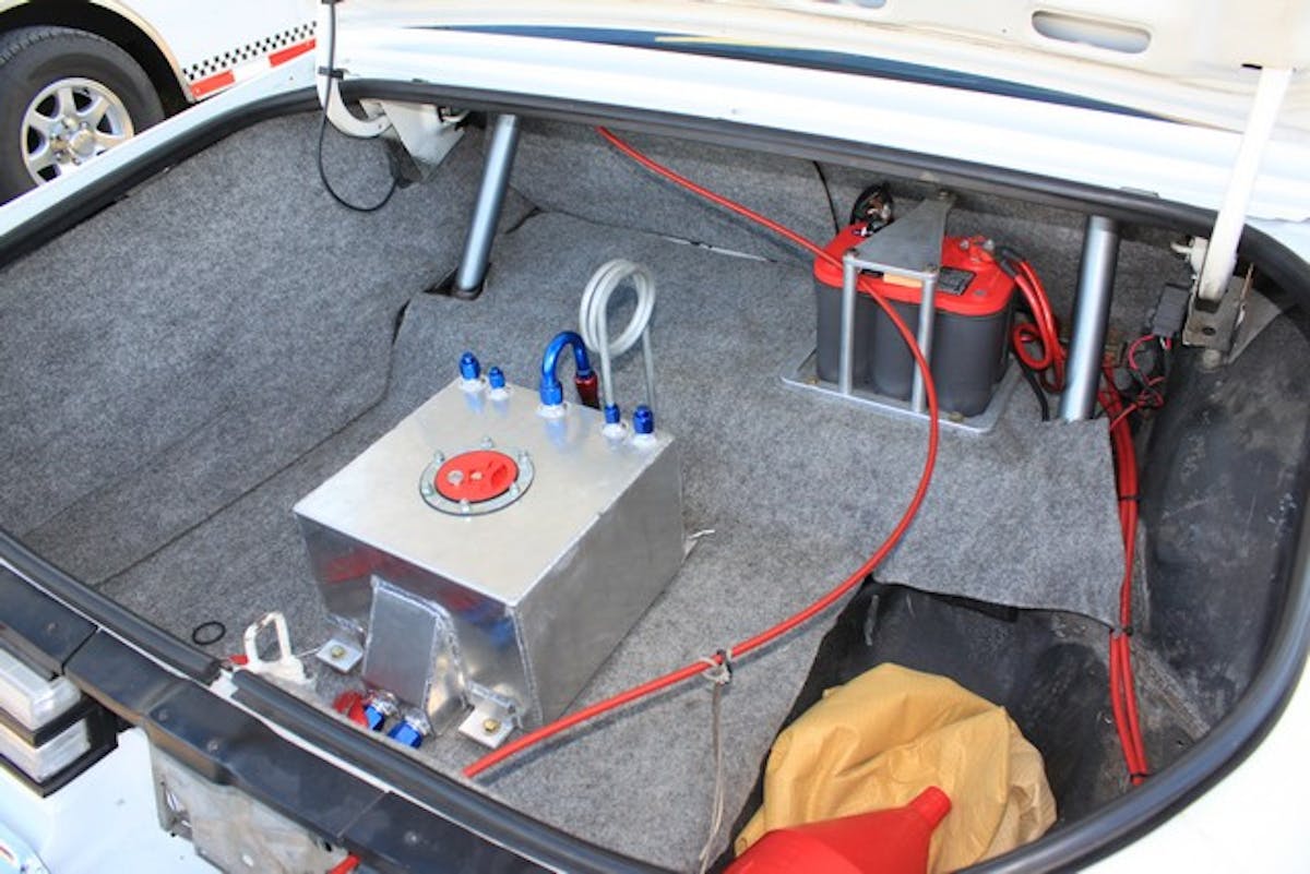 The trunk area houses a custom aluminum fuel cell and Optima battery mounted above the rear for even weight distribution.