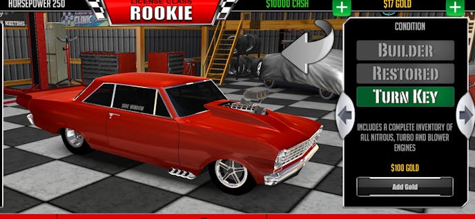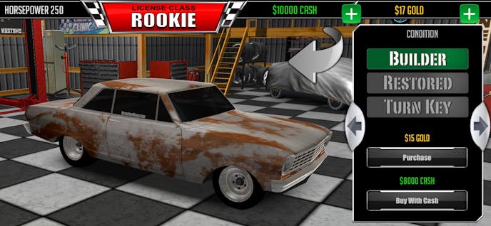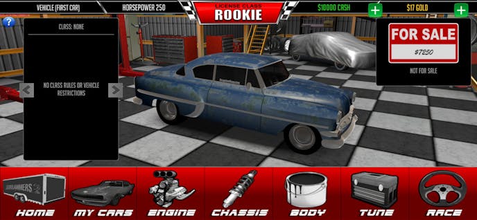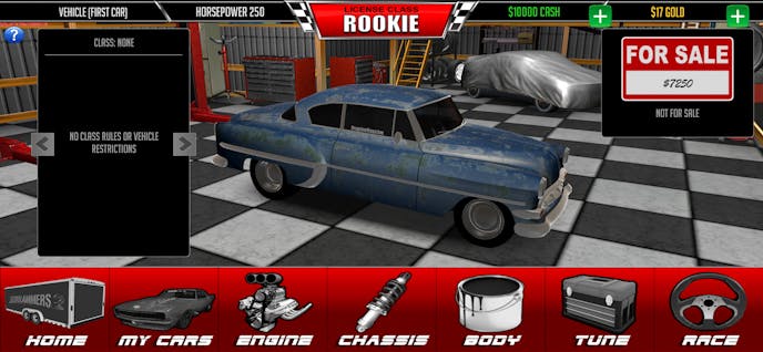 Obviously, you’ll start by creating an account — a username and a password (we’ll assume you already have the game downloaded, but if not, you can get it on the App Store for the iPhone/iPad and on Google Play for Android devices). Once registered, you’ll arrive at the “home” screen, where you can access the game settings, as well as the Dealer, the Garage, and the Race options. Door Slammers 2 awards you $10,000 in cash and $17 in gold coins to spend as you see fit. There’s also a standard, classic car you begin the game with — you can spend your initial cash on a new car if you so choose, but you’ll need to accumulate some extra cash to make the needed upgrades.
