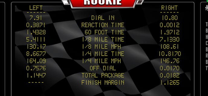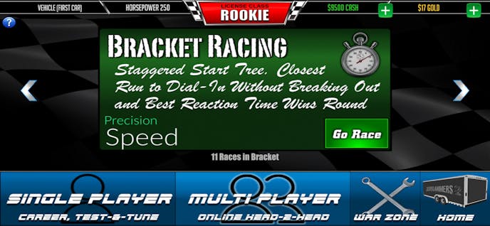 Once you’re confident in your ride and yourself and you’re ready to race against real people, hit Race and head over to Bracket Racing; there you can either choose an existing race/competitor (at right), or simply set your dial-in and delay box at left, choose a lane (left/right), and wait for an opponent to join you.