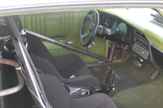 A 10-point chromoly roll cage shrouds a largely factory interior, with only a pair of aftermarket racing-style captain seats up front differentiating it. The full factory bench seat remains in the rear, making this a verifiable driver, capable of hauling a couple of flexible souls in a pinch. Chassis builder, Rick Stevens, did much of the fabrication work, lowering the car 4-inches and also building new stainless headers from scratch.