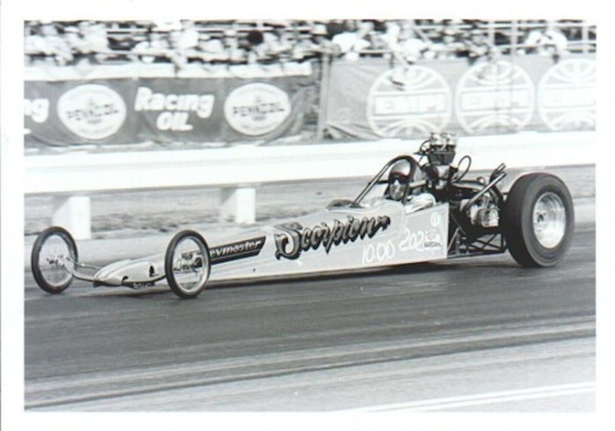 In the 1970’s, Horveth owned and sponsored the original “Scorpion” dragster that was campaigned around Southern California, sharing crew and work space with the legendary “Inch Pincher” ’56 Beetle, driven by Dan Gurney in sports car events and Dean Lowry on the quarter mile. The Scorpion was motivated by a 2100cc engine with a supercharger, producing enough power to record 9-second elapsed times. It was during this period that both Revmaster and EMPI, the manufacturer behind the Inch Pincher, were purchased together by Filter Dynamics, and in the midst of the transaction, the original Scorpion was lost and never seen again.