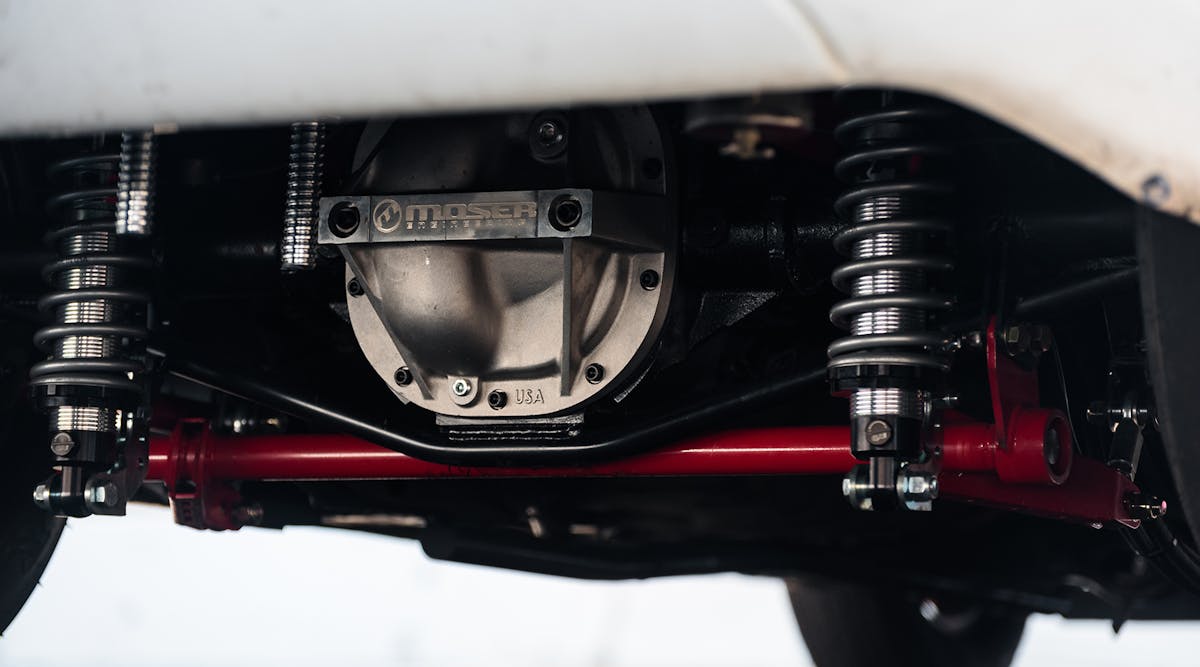 An 8.8 rearend from a GT model was found local and filled with Moser Engineering 35-spline axles, spool, housing ends, and much more. The team chose a 3.55 ratio Spicer ring and pinion and U-joints to complete the assembly.