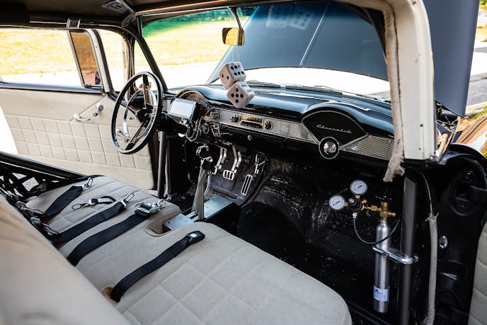 Powering Caron’s ’55 is a 408 cubic-inch SBC, built upon a Dart Machinery Little M block with Air Flow Research 235 23-degree heads and ported Edelbrock intake. An Accufab 105mm throttle body combines with a Wilson elbow. JE pistons, Crower connecting rods, and Lunati crankshaft comprise the rotating assembly.
