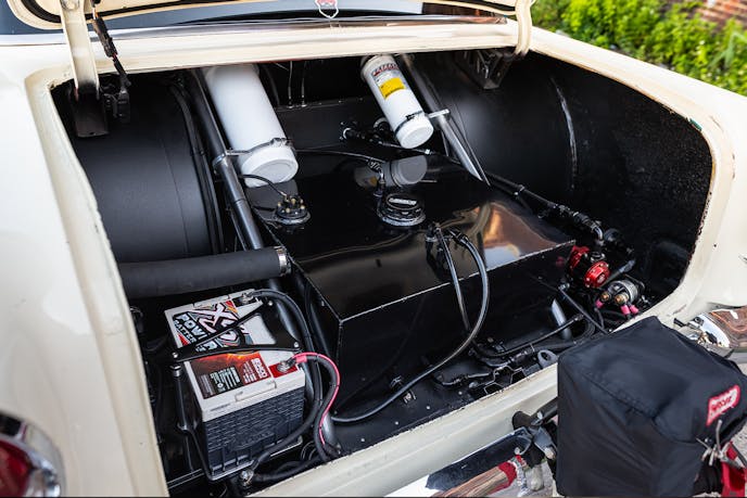 The interior is a cool mixture of race with stylish touches, including all ivory tweed interior panels and tweed bench seats. The front seat is formed to a Killduff Machine one-off clean neutral multi-lever lighting rod shifter. Lokar Performance Products prove stylish looks to the billet pedals, including a clutch pedal that activates the transbrake. A Lokar 15-inch steering wheel replicates the original-style wheel.