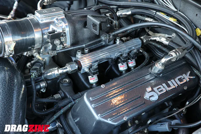Boost comes from a Precision 6765 twin-ball-bearing turbo with a billet compressor wheel. With 32-plus psi on tap and a front-mount intercooler, Evans believes the Buick is easily capable of mid-nine-second power. He doesn’t have any dyno sheets to verify it, but having driven seven, eight, and nine-second street cars for most of his adult life, he says he can sense the numbers in the seat of his pants.