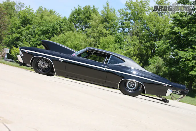 “Keith Engling at Skinny Kid Race Cars basically built the entire chassis, including the 25.2 chrome moly Funny Car cage,” said Pennywitt. “To be in accordance with the class rules, the car had to have stock framerails from the firewall forward, and the framerails were moved way up to get the car to sit low. He also fabricated the rear suspension, including the four-link, and the front suspension, including the control-arms. It has Strange shocks up front and Strange brakes all the way around.”