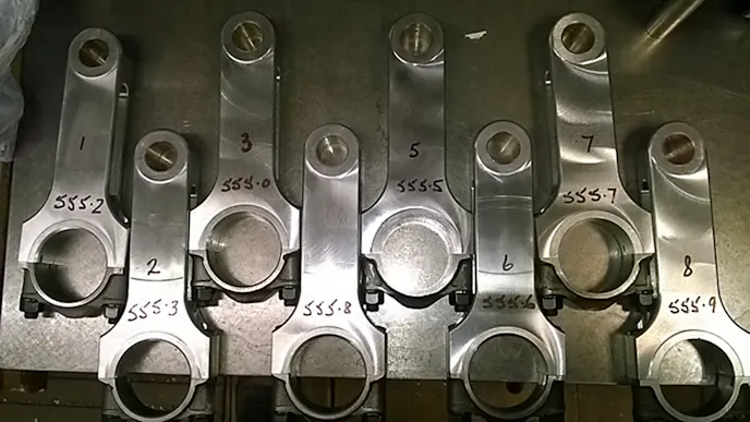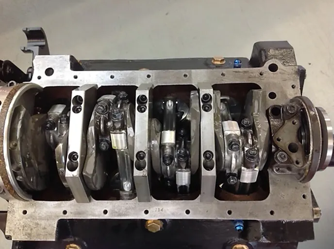 The flat-tapped “fat” camshaft is a product of Kent Cams that has oversized journals and facilitates higher lift lobes, with lifters from Kershaw Engineering and titanium pushrods (3/8-inch tube on the intakes and 3/8-inch solid heat-treated titanium on the exhaust side) with Daimler tips made by Hopkinson. A set of Crane valve springs originally intended for a Chevy LS motor are also employed. The head studs, main studs, and all other fasteners are ARP. Bearings were manufactured by ACL to “Triple R” (Robin Read Racing) specifications.