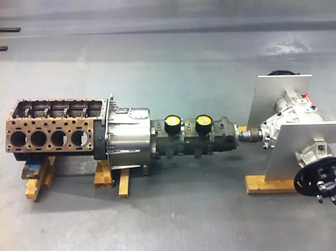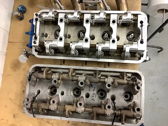 The basis of Read’s engine is a stock 2.5L Daimler cast iron block that has been heavily fortified on the bottom end by Robin and his longtime “chief engineer” Bertie Hopkinson. A billet aluminum version is planned for the future. Read and Hopkinson have developed straight-port billet aluminum heads to replace the OEM cast aluminum units, with the ever-resourceful team machining “hand-me-down” titanium intake valves from Pro teams to fit the Daimler; the exhaust valves are stainless steel from GS. Credit Bertie Hopkinson for fabricating the shaft rocker arm setup, too.