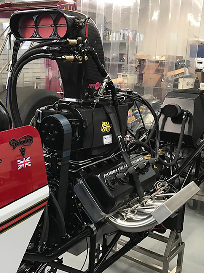 This is the fourth in a series of diggers raced by Robin —the first being a front-engined Volvo-powered car built in 1974. At the time, it was purported to be the world’s quickest and fastest naturally aspirated four-cylinder gas-burning drag vehicle and credited with a best performances of 10.70s, in the high 130 mile-per-hour range. After Robin sold the car it won three European championships in Comp Eliminator.