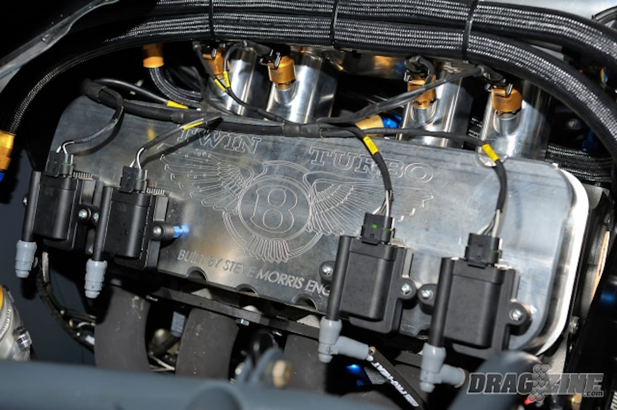 Morris utilized a Brodix aluminum block and stuffed it with a 4.625-inch Callies crankshaft and Ultra I-beam connecting rods, custom Diamond pistons, and a custom in-house roller camshaft to complete the short block. A set of CNC-ported, 14.5-degree Sonnys/Brodix heads were added, as was a custom SME billet intake manifold. A number of other top-quality parts and pieces fill out the engine combo, including a Jesel belt drive setup and a Pro Series shaft rocker kit, Crower Endura-Max lifters, Trend Industries pushrods, an Innovators West balancer, and a laundry list of other components. Morris also added a five-stage dry sump oiling system with a Moroso pan and six-stage pump with a Peterson Fluid Systems tank to handle the oiling needs of such a potent package.