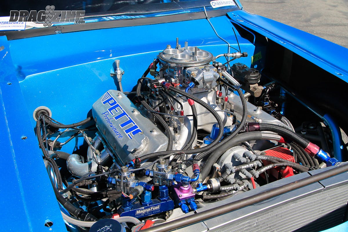 Prior to the crash, the big block Chevrolet-based powerplant, built by Pettis Performance around a Dart Machinery block, was punched out to 598 cubic inches. The short block was filled with GRP rods, a Callies crankshaft, Ross Pistons, and a Comp custom camshaft. An Edelbrock intake with a Dale Cubic-prepped Holley Dominator carburetor sits atop a set of BES-prepared Brodix Head Hunter cylinder heads, filled with Jesel components and PAC valve springs. A set of REF 2-/14 to 2-3/8 headers help empty the cylinders.